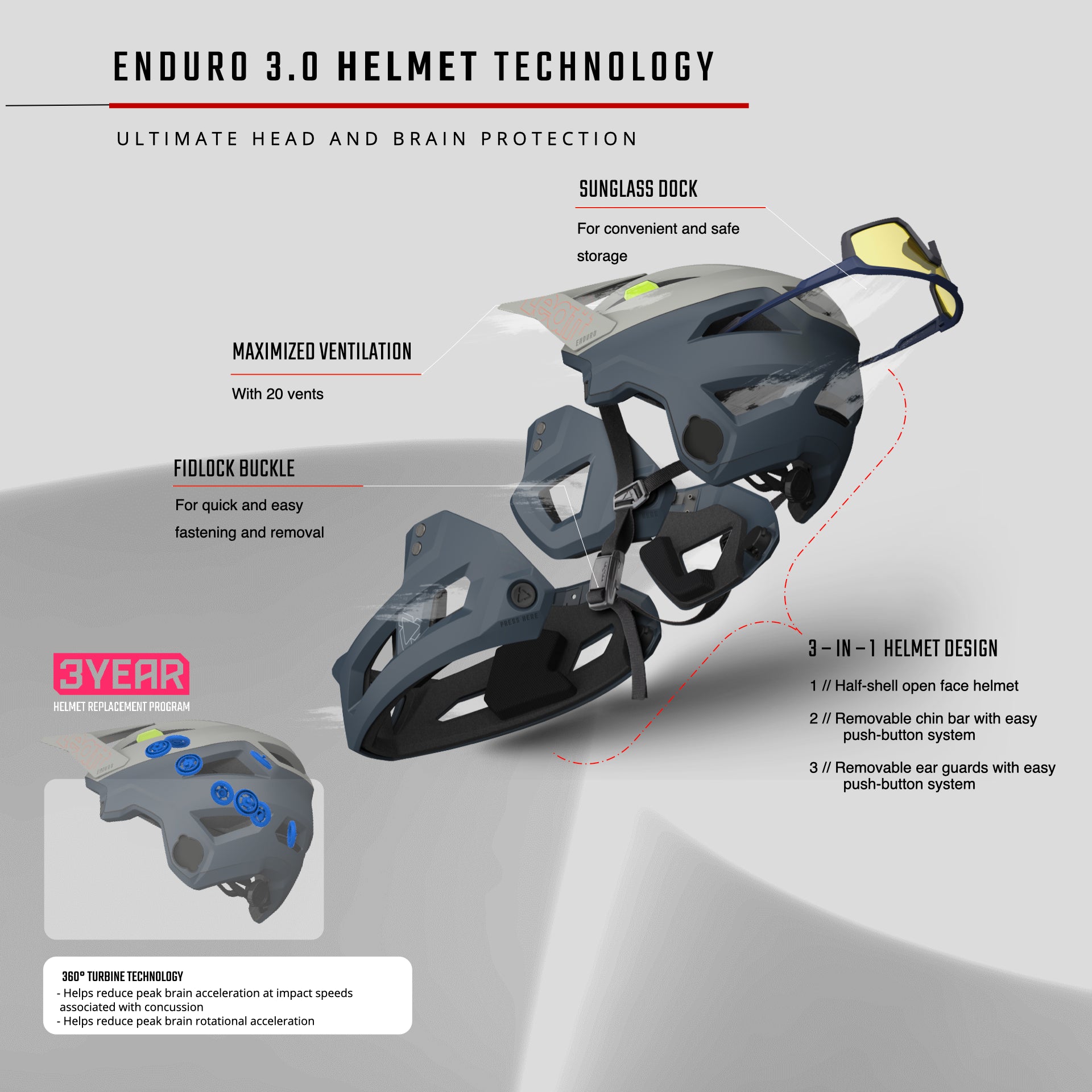 Fabricado con una carcasa de polímero ligero, el casco Enduro 3.0 incorpora la construcción Powerbridge para una mayor resistencia. Además, incorpora la tecnología 360° Turbine. Estos pequeños discos azules con movimiento de 360° están fabricados con un material que absorbe la energía. Esta tecnología ofrece dos ventajas exclusivas: la reducción de la aceleración rotacional en la cabeza y el cerebro, y la absorción de energía en el impacto, a nivel de conmoción cerebral.