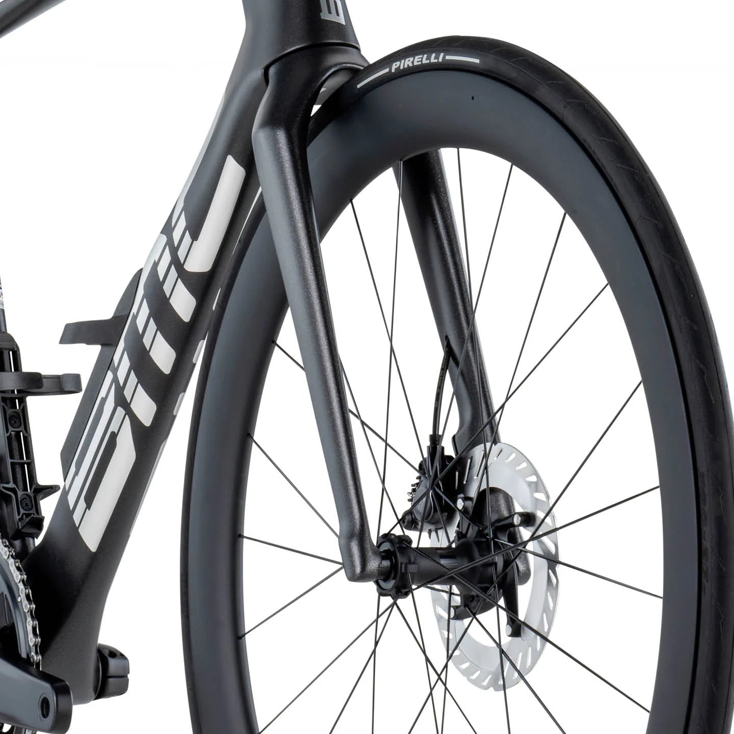 Los brazos ultraanchos de la horquilla no se parecen a nada visto en el pelotón y alejan del cuadro las turbulencias de aire generadas por la rueda delantera.