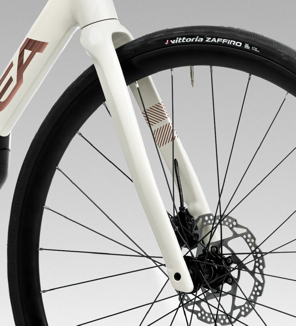La horquilla de carbono OMR ahorra peso y absorbe vibraciones sin comprometer la rigidez en las frenadas o las giros cerrados.