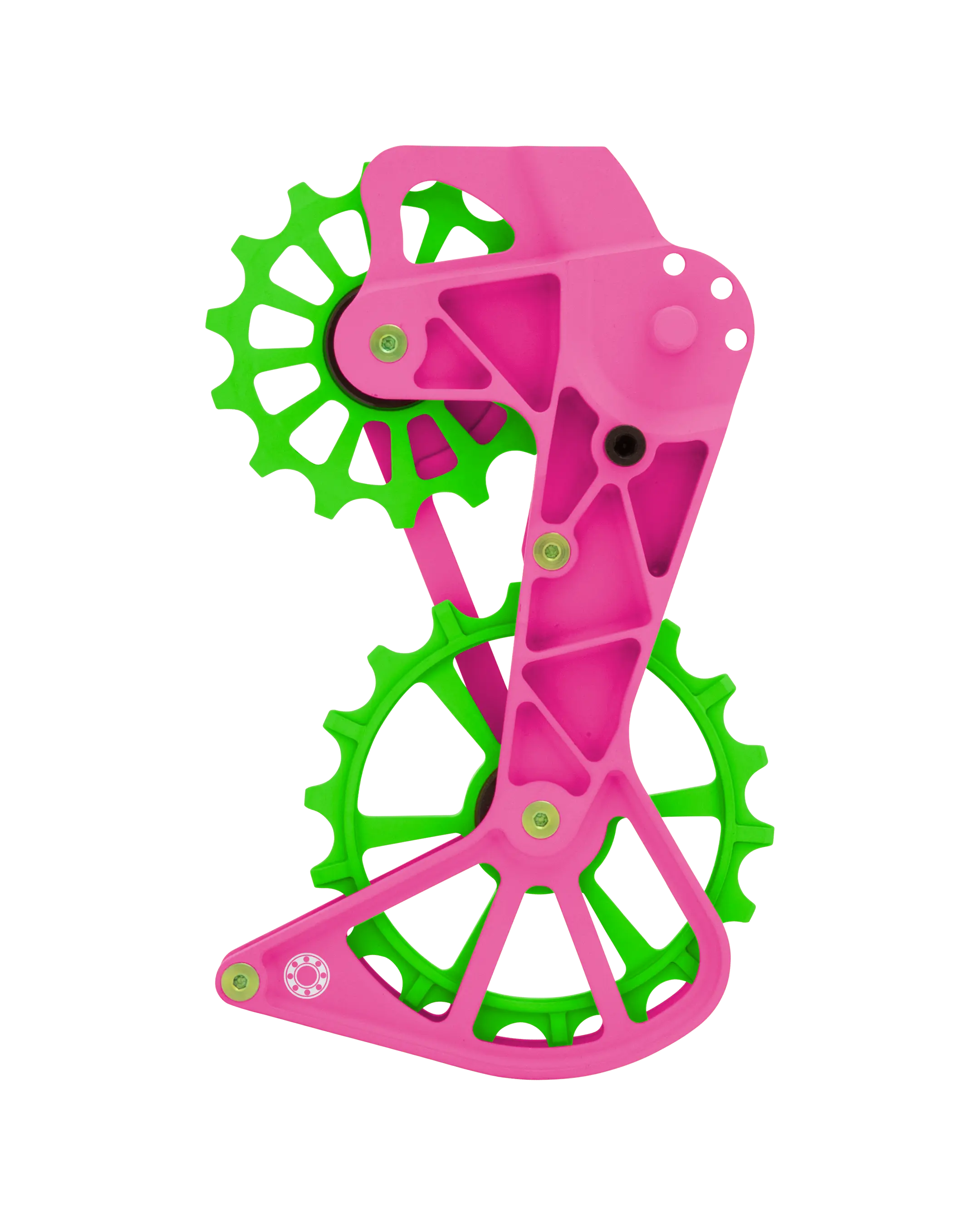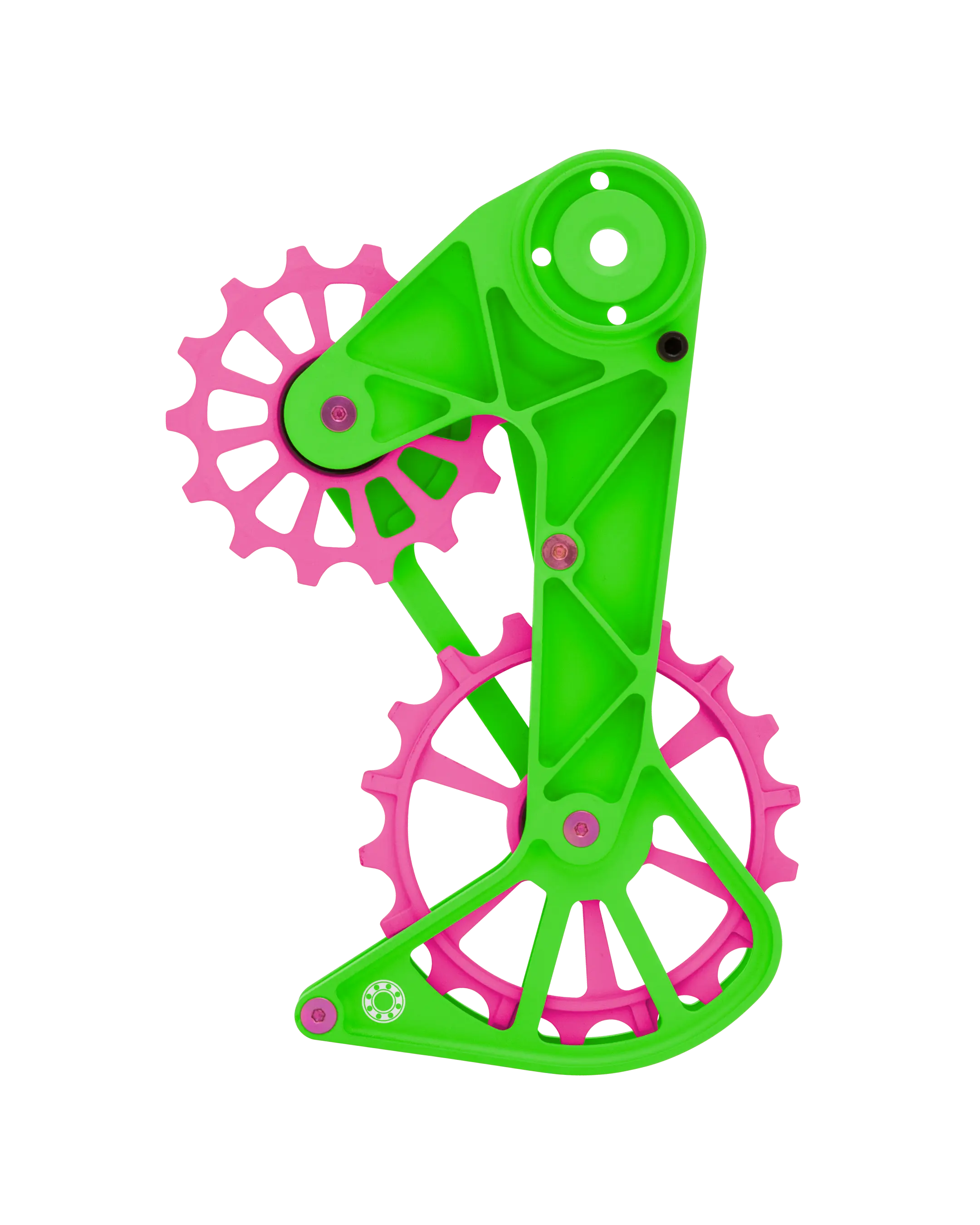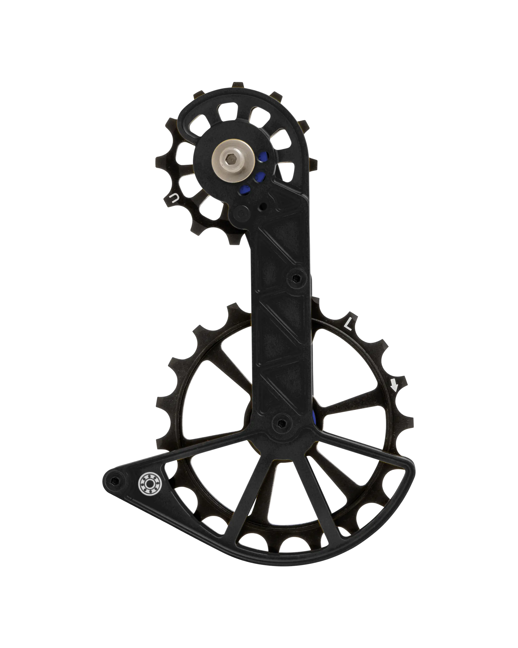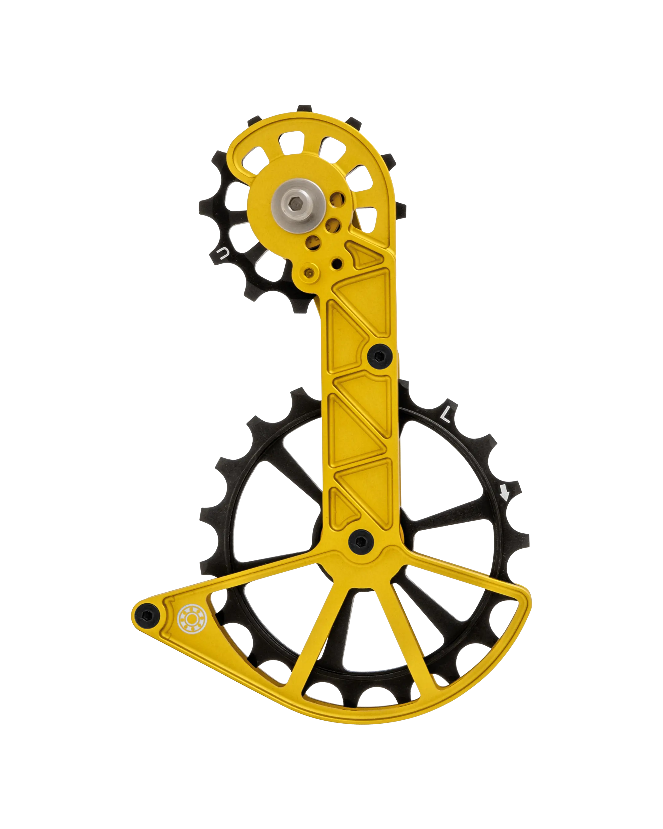 Imagina reemplazar las poleas estándar de tu desviador por una polea superior cerámica de 12 dientes y una polea inferior de 19 dientes, montadas en la jaula más rígida del mercado.