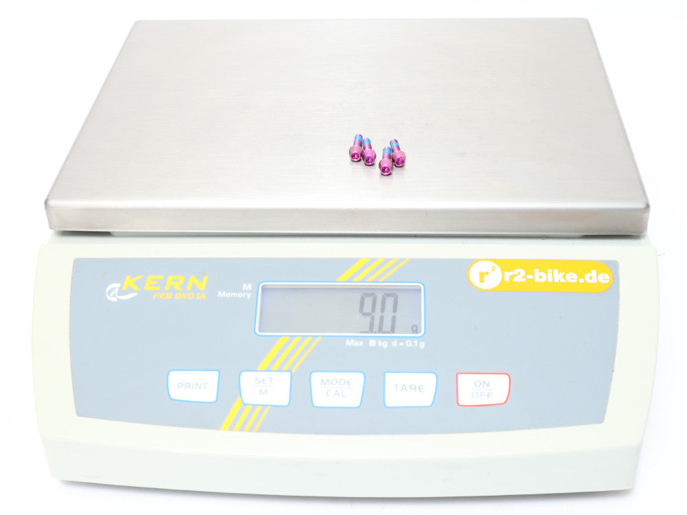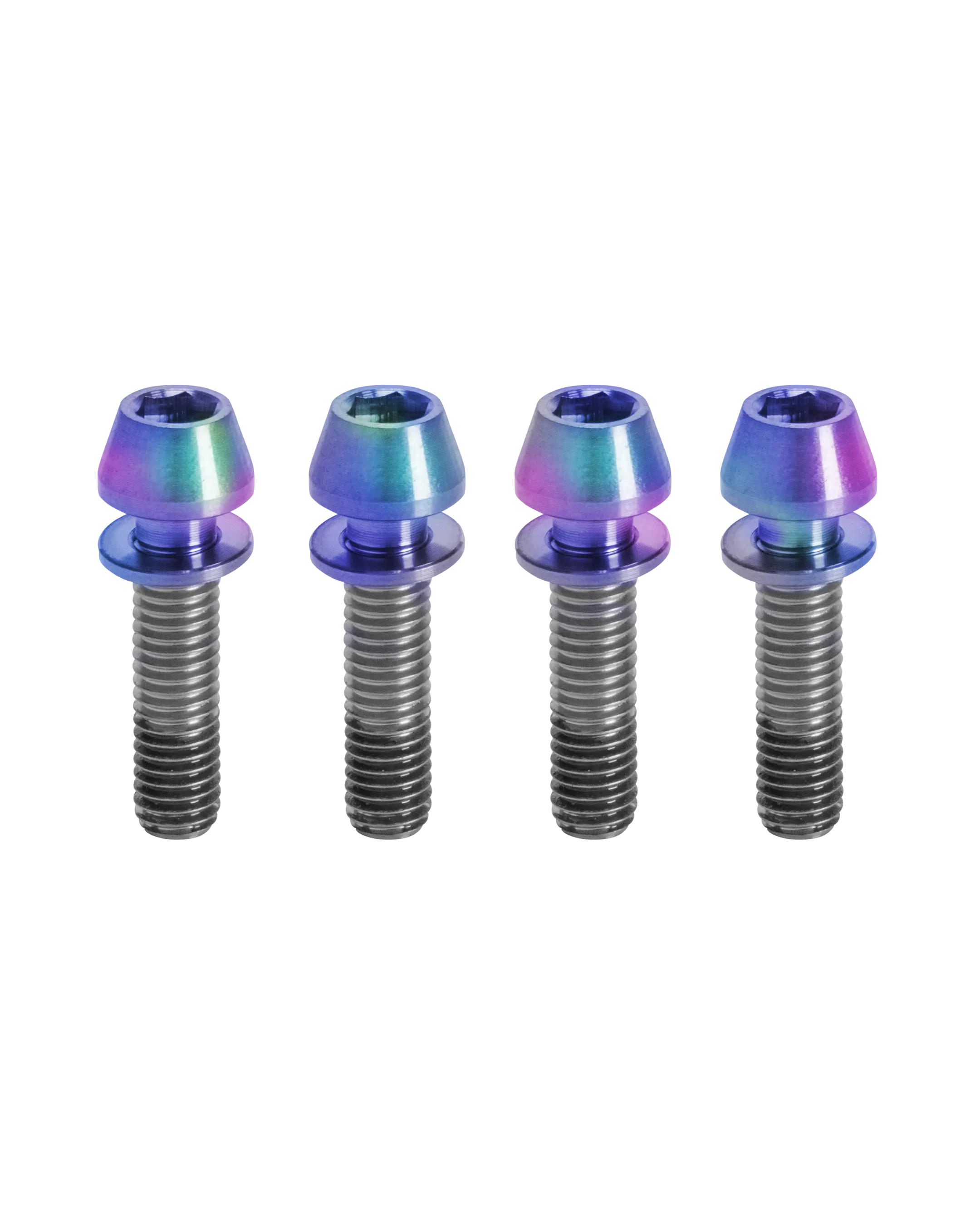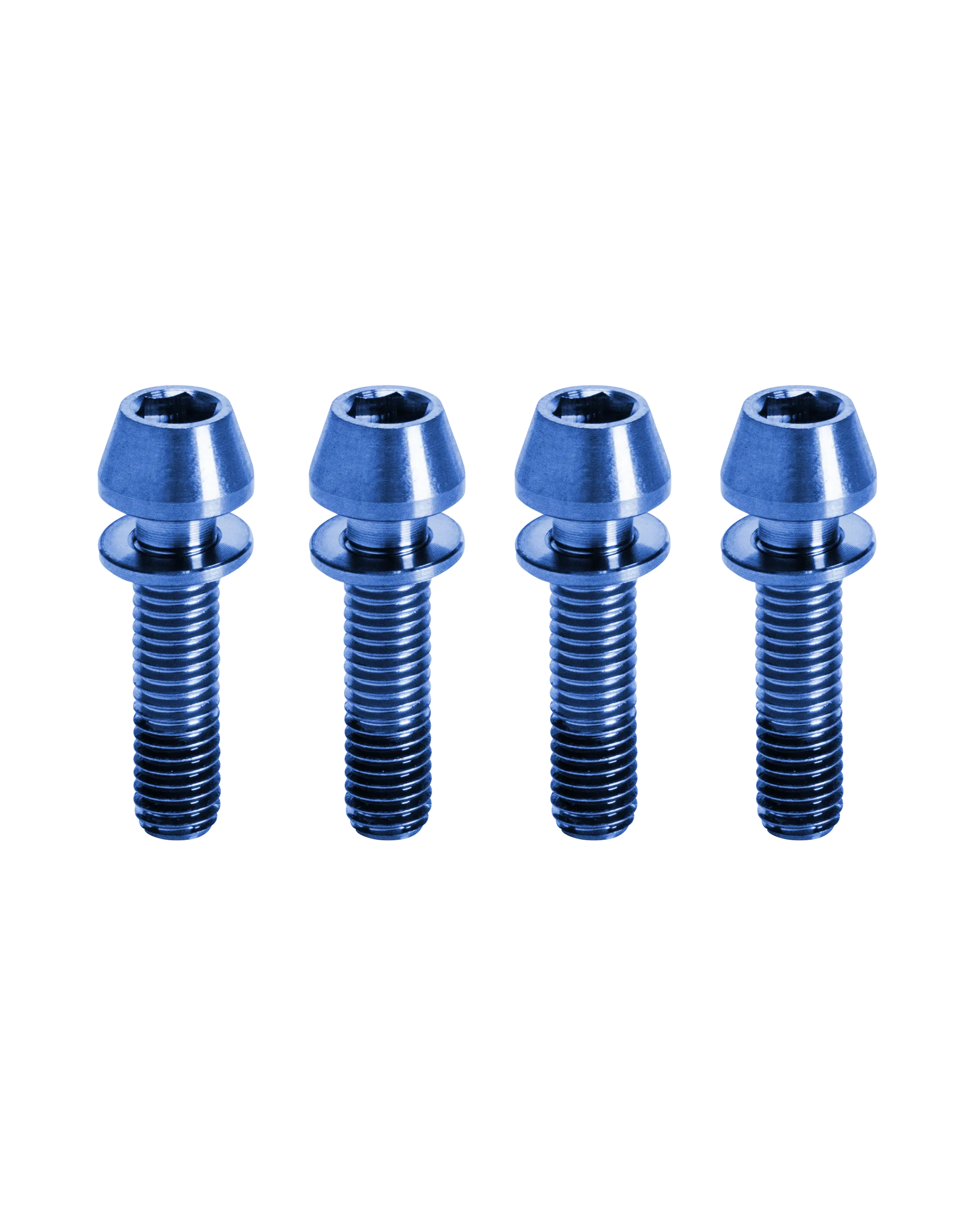 Los tornillos de titanio de Kogel tienen una longitud de 20 mm y están fabricados en titanio de alta calidad. También están disponibles en una variedad de colores anodizados para personalizar tu bicicleta.